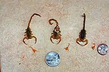 The Arizona bark scorpion (Centruroides sculpturatus, once included in Centruroides exilicauda) is a small light brown scorpion common to the Sonoran Desert in the southwestern United States and northwestern Mexico. An adult male can reach 8 cm in length (3.14 inches), while a female is slightly smaller, with a maximum length of 7 cm (2.75 inches).[1]