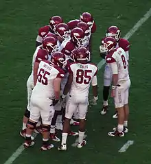 The first University of Arkansas football team was formed in 1894 and coached by John Futrall, who was a Latin professor at the university.[3] That team played three games: two against Fort Smith High School and one against Texas.[3] Before the 1909 season, the teams were called the Arkansas Cardinals and a bird was the school's mascot.[4] The name and mascot changed following the 1909 season when the football team, coached by Hugo Bezdek, finished 7–0.[5] The Cardinals became the Razorbacks after Arkansas defeated LSU 7–0, and coach Bezdek told a group of reporters after the game that his team played like a "wild band of Razorback hogs". The name stuck, and the student body voted to change the mascot.[6][7] The "Wooo Pig Sooie" or "Calling The Hogs" became a tradition and the official school cheer in the 1920s when farmers rushing out to meet the bus returning from an away game called the hogs as a greeting.[8][9][10] Arkansas prevailed over powerhouses Oklahoma, LSU and Washington University in St. Louis in 1909, and was declared unofficial champions of the South and Southwest.[3] It was with the help of Steve Creekmore that this was accomplished. Creekmore became perhaps the first Razorback star, a quarterback from Van Buren who initially played only intramurals.[3] Bezdek used Creekmore to install a very early edition of the hurry-up offense, as the team never huddled and chased the ball after every play.[3] Creekmore was also known for "fast and slippery running, blocking, and passing" and could also return punts and tackle well.[3]