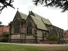 The chapel is built in red sandstone and rendered brick with a slate and tile roof.[20][22] The sandstone came from quarries in Runcorn.[23] Its plan consists of a four-bay nave with a north aisle, a two-bay chancel, a porch and a bell turret to the north. On the east front is a canted oriel window supported on a buttress. The bell turret is octagonal with eight lancet openings at the bell stage and is surmounted by a red-tiled spirelet.[20] Inside the chapel is a richly painted iron screen, which hides the central heating, and three corona-shaped chandeliers. The stained glass in the east window, dated 1895, is by Kempe.[22] The font is a richly carved stone bowl on a cluster of marble columns. In the chancel is a piscina and a triple sedilia.[20]