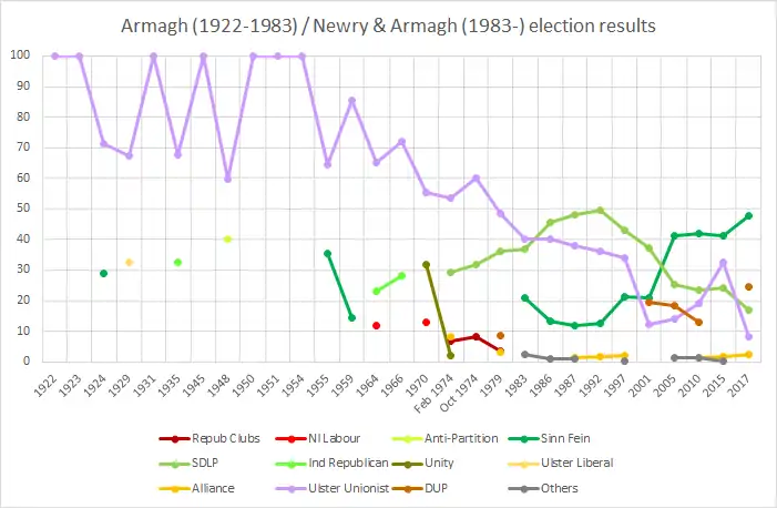 In 1922, following the establishment of the Parliament of Northern Ireland, the number of seats in Northern Ireland at Westminster was cut from 30 to 13 under the Government of Ireland Act 1920.[2] The single-seat constituency of Armagh consisted of the entirety of County Armagh. From its inception, Armagh had a unionist majority, though by the 1970s the nationalist vote was in the mid-30s%. In 1951, it was one of the last four seats to be uncontested in a UK general election, and in 1954 it saw the last uncontested by-election in the UK. In 1974 the Ulster Unionist Party repudiated the Sunningdale Agreement and so did not reselect the pro-Sunningdale MP, John Maginnis. Instead, they ran Harold McCusker, who held the seat until 1983. He was then elected for Upper Bann, which contained part of Armagh.