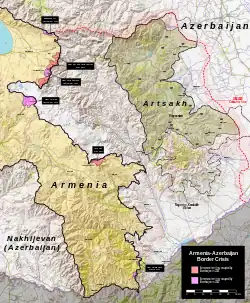 The issue of border demarcation between Armenia and Azerbaijan arose immediately after the defeat of Armenia in the Second Nagorno-Karabakh War, and Azerbaijan regaining control over its occupied territories. Before the 2020 war, there was no mutually agreed upon border between Armenia and Azerbaijan, with certain Armenian villages and agricultural workers crossing over into Azerbaijan.[89] During Soviet times, cross-border interactions and movements were common.[85][90][91]