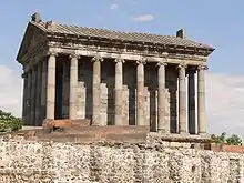 • Mihr - Cognate with the Iranian Mithra. God of the sun and light, son of Aramazd, the brother of Anahit and Nane. Historically, despite his high place in the pantheon, worship of Mihr was eclipsed by Vahagn[2] (indeed, Mihr's worship appears to have been supplementary to Vahagn's[32]), and little is known about his worship aside from similarities to the Iranian Mithra and the absence of the Mithraic mysteries.[2] Mihr was identified with Hephaestus by Movses Khorenatsi and later authors.[3] His center of worship was located in Bagaharich,[2] and the temple of Garni was dedicated to him.