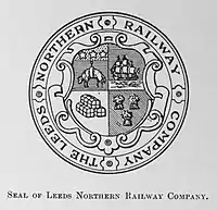 Hull and Barnsley Railway The arms of Kingston-upon-Hull - Azure three Ducal Coronets in pale Or.[18] The arms of Barnsley - Argent on a chevron Gules between two shuttles fessewise in chief and in base as many pickaxes in saltire Proper a falcon wings elevated and holding in the dexter claw a padlock Or between two boar's heads couped of the last each holding in the mouth a cross patee fitchee in pale of the first a chief Sable thereon a cross patee between two covered cups all within a bordure embattled Or.[19] |