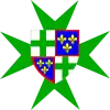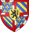 Quarterly, I argent, a cross potent or, cantonned by four crosslets or (for Jerusalem); II quarterly 1 and 4 argent five escutcheons azure in cross, the two escutcheons on the sides couched, each escutcheon charged with five plates in saltire, a bordure gules charged with twelve three-towered castles or, masoned and ajouré azure and charged by four visible bits of a cross flory vert (for Portugal), 2 and 3 quarterly 1 and 4 azure, three fleurs-de-lys or (for France), 2 and 3 gules, three lion passants or, III or, a lion gules, armed, langued and crowned azure (for Armenia) and IV argent, a lion gules, armed, langued and crowned or (for Cyprus), overall barry of eight of argent and azur, a lion gules, armed, langued and crowned or (for Lusignan-Cyprus).[54]