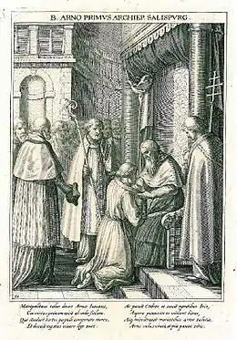 In 785 he was made bishop of Salzburg and in 787 was employed by Tassilo III, duke of the Bavarians, as an envoy to Charlemagne at Rome. He appears to have attracted the notice of the Frankish king, through whose influence in 798 Salzburg was made the seat of an archbishopric; and Arno, as the first holder of this office, became metropolitan of Bavaria and received the pallium from Pope Leo III.[1]