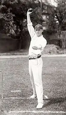 He played in the Headingley (Leeds) Ashes Test of 1905.[1] A very tall, right-arm fast bowler who operated off a long, bounding approach, he took 5 for 57 in the first innings of a drawn match.[2] Although he dismissed the cream of Australia's batting, taking the prized wicket of Victor Trumper in both innings, he was not selected again.[1]