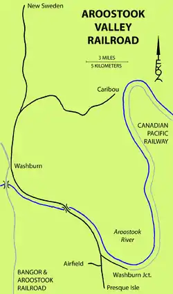 Arthur R. Gould purchased a Presque Isle sawmill in 1889. He began to investigate log driving on the Aroostook River as the supply of local logs was exhausted. He needed a railroad to move logs from the river to his sawmill; and recognized the possibility of using the river's water power to generate electricity.[3] The railroad was founded in 1902 and the Maine Railroad Commission granted it approval to operate on 1 July of the same year.[1] Its survey of the planned route was approved the next year, but not until 20 June 1910 was construction completed and the safety certificate approved.[1] The AVR's official opening was on 1 July 1910; at the time it operated 10.8 miles (17.4 km) of track between Presque Isle and Washburn, Maine.[1] In 1911, 11.3 miles (18.2 km) of track was added, extending the line's terminus to New Sweden and in 1912 track was extended to Caribou, a further 7.13 miles (11.47 km). The line was electrified for the early part of the railroad's history.[1]