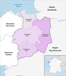 - Arrondissement of Rennes, (prefecture of the Ille-et-Vilaine department: Rennes) with 109 communes.[3] The population of the arrondissement was 599,717 in 2016.