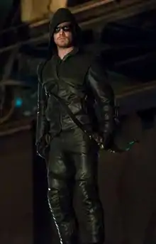 - Stephen Amell as Oliver Queen / Arrow / Green Arrow,[16][17] a billionaire playboy turned hooded vigilante-hero who is initially known as the "Hood", "Vigilante", and simply "Arrow". He is based on the DC Comics character Green Arrow. He survives on an isolated island for five years after the sinking of his father's yacht. Oliver returns to his home city with a mission—to right the wrongs of his father and save the city from the crime that has grown in his absence. Amell was one of the first actors to audition for the role, and Kreisberg felt that he "hit the target from the outset" and "everyone else just paled in comparison".[18] In season six's finale, Oliver confesses he's the Green Arrow and is sent to prison where he's known as "Inmate 4587". The actor, who was already in shape from Rent-a-Goalie, did physical fitness training at Tempest Freerunning Academy in Reseda, California. Amell received archery training as well, which included watching a video on how archery has been displayed inaccurately or poorly in television and film before learning the basics of shooting a bow.[18][19] For Amell, the appeal of portraying Queen was that he saw multiple roles tied to the same character: "There's Queen the casual playboy; Queen the wounded hero; Queen the brooding Hamlet; Queen the lover; Queen the man of action, and so on".[18] Amell also portrays Dark Arrow (Oliver's Earth-X doppelganger) in the sixth season's crossover "Crisis on Earth-X".[20]