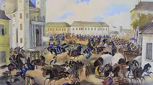 Kossuth, who did not want to give the supreme command to Görgei, conferred it on the Polish general Henryk Dembiński. Many officers from Görgei's Army of the Upper Danube (György Kmety, Lajos Aulich) were astonished at Kossuth's decision and sought to protest, but Görgei ordered them to accept it.[25] One of the first decisions of the new commander was to order many of the Hungarian units, under the lead of Görgei and Klapka, to retreat, enabling the Austrian troops of General Franz Schlik to escape from their encirclement.[21] On 25–27 February 1849, Dembiński, after making mistake after mistake, lost the Battle of Kápolna (in which Görgei's VII corps could not participate; because of Dembiński's poor deployment, the VII corps arriving at the battlefield only after the battle ended).[26] The Hungarian officers revolted against the Polish commander and demanded his dismissal and that a Hungarian general be put in his place.[27]