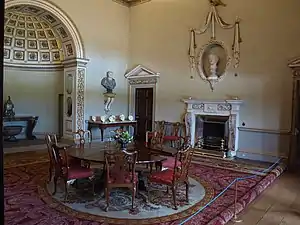 • The North Dining Room: Is a cube of 27 feet (8.2 m) a side, with a large apse in the middle of the south wall, this is richly coffered, and flanked by pilasters with richly carved rinceaux and mirrored panelling on their side facing the apse. Within the apse just behind the pilasters are two doors leading to a staircase that links to the service areas and kitchen. The two fireplaces are carved from Sicilian Jasper & white marble, with reliefs from Aesop's Fables, the eastern fireplace with The Bear and the Bee-Hive and the western The Sow and the Wolf, were carved by Thomas Carter, above are oval niches surrounded by plaster swags held in the talons of gilt plaster eagles. The ceiling has a small cove above a cornice, the edge of the ceiling proper being edged by a plaster beam that enclose a circular plaster beam both decorated with rinceaux, the centre of the ceiling is a shallow dome. The four doors that flank the fireplaces have pediments. The Venetian window is framed by Corinthian pilasters and columns. A large classical style porphyry table from Italy is in the centre of the apse, the curve of which follows that of the apse, with a red granite wine-cooler, two marble top tables flank the apse above which are brackets to support a bust. There is an elaborate silver candelabra over three feet in height in the centre of the circular dining table, the dining chairs are mahogany originally the sets were of red leather and the richly patterned and coloured Axminster carpet mirrors the form of the ceiling dome and plaster beams. The room is white with some gilding. An early 18th-century bracket clock sits in the centre of the porphyry table.