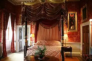 • The North State Bedchamber: Is 20 feet (6.1 m) square. The fireplace is of white marble, the side pilasters carved with shallow reliefs of eagles, patera and other motifs, the frieze is of a darker white-veined marble with carved central plaque and meander of white marble. The ceiling has a rich entablature, the frieze decorated with palmettes, the centre of the ceiling has a circle outlined by a richly molded plaster beam. The dado, ceiling and door surrounds are white highlighted in gilt. There is a table with a top made from a mosaic bought as originating from Hadrian's Villa, now believed to be an 18th-century copy. The four-poster bed is Regency. The walls are covered in patterned red velvet.