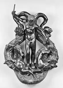 Benedetto da Rovezzano came to England in 1524 to execute a tomb for Cardinal Wosley, part of which, after many vicissitudes, is now in the crypt of St Paul's Cathedral. Pietro Torrigiano of Florence executed the tomb of Henry VII in Westminster Abbey. Alessandro Leopardi, at the beginning of the 16th century, completed the three admirable sockets for flag-staffs which still adorn the Piazza San Marco, Venice. A further development showed itself in the production of portrait medals in bronze, which reached a high degree of perfection and engaged the attention of many celebrated artists. Bronze plaquettes for the decoration of large objects exhibit a fine sense of design and composition. Of smaller objects, for church and domestic use, the number was legion. Among the former may be mentioned crucifixes, shrines, altar and paschal candlesticks, such as the elaborate examples at the Certosa of Pavia; for secular use, mortars, inkstands, candlesticks and a large number of splendid door-knockers and handles, all executed with consummate skill and perfection of finish. Work of this kind continued to be made throughout the 17th and 18th centuries.[2]