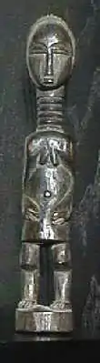The twin figures are carved into a number of other ceremonial related wood, including staffs for religious initiation and healing.[7] Associated with these figures is the construction of small-scale houses for the twin (called ka-bangka in Temne) which are spread throughout the area.[6] This use of twin figures is associated with wider spiritual powers that twins are claimed to possess in Temne beliefs.[8]