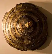A few decorative bronze Urartian shields have been found near Van (they are stored in the British Museum and Berlin museums) and 14 were excavated at Karmir Blur. They have diameters ranging between 70 and 100 cm and were not made for combat, as judged from the thinness of the metal and the character of the handles. All these shields contain concentric circles of lions and bulls which were designed so that no figure would appear upside down. The images were first stamped and then engraved with various instruments. The Assyrian king Sargon II described six golden Urartian shields, which were looted in Musasir, weighing 6.5 kg each. They have not been recovered thus far.