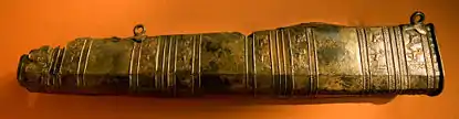Poorly preserved remains of Urartian mail of Argishti I were excavated at Teishebaini.[14] Entire (or parts of) wide bronze belts were found in Turkey (Altıntepe), Iran (Lake Urmia) and Armenia (Karmir Blur). The belts were about 1 meter long and 12 cm wide and were designed to protect archers.