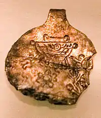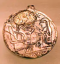 Jewelry of Urartu had two gradations: ornaments made of precious metals and stones for the king and his family, and their simplified bronze versions used by the rich. Many jewelry items were also used as amulets.[15] Annals of the Assyrian king Sargon II mention vast amounts of Urartian jewelry items made of silver and gold which were taken from Musasir in 714 BC.[1] They are not preserved and some may have been melted by treasure hunters.[3] The two largest recovered jewelry items are shown below. They are the pectoral decoration excavated at the late Urartian capital Rusahinili and the cover of the cauldron found at Teishebaini. Smaller items include golden pins, earrings, a bracelet and a few medallions. Jewelry was worn in Urartu by both men and women. Women's jewelry usually portrayed the Urartian goddess Arubani, wife of Ḫaldi – the supreme god of Urartu. Also common are Mesopotamian motifs such as tree of life and winged sun. More accessible jewelry included bronze bracelets and earrings and carnelian beads.[15]