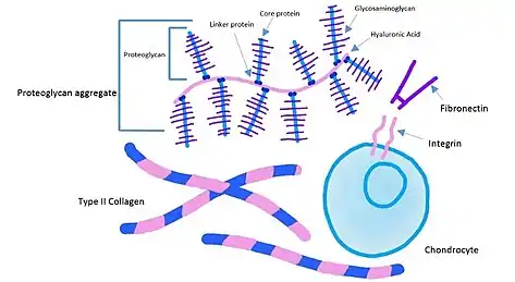 • Proteoglycans: Proteoglycans are the second most abundant macromolecule in the ECM of cartilage.[5] Proteoglycans consist of a linker protein along with a core protein to which glycosaminoglycans (GAGs) attach. The most common GAGs are chondroitin sulfate and keratin sulfate. Proteoglycans attach to a central chain, usually hyaluronic acid, via a linker protein, to create larger proteoglycan aggregates.[3] Proteoglycans are hydrophilic and therefore attract and restrain water molecules. This provides cartilage with its intrinsic ability to resist compression.
