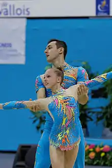 ![]() Artur Beliakou and Aliona Dubinina at the 2014 Acrobatic Gymnastics World Championships. | |