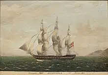 She was followed by two other ships by the same name. The first of these ships subject to major repairs undertaken by Børge Gabriel Lind at Copenhagen in 1804. She embarked on an expedition to either Canton or the East Indies under the command of captain Hans From in 1804.[2] She was severely damaged in a storm on the way back. She was subsequently sold by From on Mauritius (then Isle de France) and replaced by another ship by the same name.