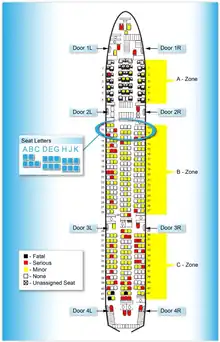 A third passenger, Liu Yipeng, died of her Injuries at San Francisco General Hospital six days after the accident.[1]:108–110[32][33][34][35] She had been wearing her seatbelt and was seated in seat 42A, which is in the last row of passenger seats on the left side of the aircraft, immediately forward of door 4L. During the crash, the back of Yipeng's seat rotated back and against the floor, leaving her exposed. Her injuries were likely the result of having been struck by door 4L, which separated during the airplane's final impact.[1]:110