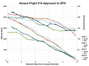 Four consecutive days of Flight(s) 214 final approach airspeeds and glide paths (July 6 crash flight shown in red).