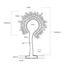 Aspergillus wentii produces single-celled, globose, conidia (singular conidium) in unbranched, filamentous chains.[15] Young asexual conidia (also called spores) start off smooth, colourless, and ellipsoidal before maturing into rough, globose spores approximately 4.5–5 µm in diameter.[5][15][3] Aspergillus wentii conidia can appear anywhere from darker yellow to brown in colour when mature and have a single wall, unlike related species Aspergillus tamarii whose conidia have a double wall membrane.[15][10][5] The elongating chains of conidia are dispersed through slightly pigmented, vase-shaped structures known as phialides that are around 6–8 µm.[5][3][6] The phialides sit on top of almond-shaped structures known as metulae that are about 10–20 µm in length and also slightly pigmented.[5][6][3] Together, these metulae and phialides structures radiate outward from a spheroid structure known as the vesicle, layering around its entire surface area.[6][5] The vesicle can grow to a diameter of 80 µm, with a completely fertile spheroid surface area.[5][6] Collectively, this large globose complex made up of the vesicle at the centre with metulae and phialides radiating outward is called the conidial head.[5][15][6] The conidial head can vary from tan-yellow to darker coffee-coloured brown and grow as big as 500–800 µm in diameter.[15][10][5][6] The conidial head is affixed atop of a thick, aseptate stalk known as a stipe. Aspergillus wentii stipes are notable for being interspersed and longer than average Aspergillus stalks.[6] The stipe and conidial head together form a translucent, rod-shaped structure collectively known as the conidiophore that in turn, extends from the hyphal tip.[16][5][15] The conidiophore can grow anywhere between 3–5 millimeters in length, has a glassy appearance (described as hyaline) and typically have a smooth texture, although granular conidiophores have been observed.[3][6][15] Aspergillus wentii produces aerial hyphae, white or sometimes yellow in colour that can grow to a few millimeters in length.[10] Aspergillus wentii foot cells have dense walls and are branched.[4]