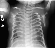 Jeune syndrome is a rare genetic disorder that affects the way a child's cartilage and bones develop. It begins before the child is born and primarily affects the child's rib cage, pelvis, arms and legs.[5] Usually, problems with the rib cage cause the most serious health problems for children with Jeune syndrome. Their rib cages (thorax) are smaller and narrower than usual, which inhibits the child's lungs from developing fully or expanding when they inhale. The child may breathe rapidly and shallowly. They may have trouble breathing when they have an upper or lower respiratory infection, like pneumonia. Breathing trouble can range from mild to severe. In some children, it is not noticeable, aside from fast breathing; however, in others, breathing problems can be fatal. About 60% to 70% of children with this condition die from respiratory failure as babies or young children. Children with Jeune syndrome who survive often develop problems with their kidneys, and over time they may experience kidney failure.[2] As a result, few children with Jeune syndrome live into their teen years. Children with Jeune syndrome have a form of dwarfism. They are short in stature, and their arms and legs are shorter than most people's.[6]