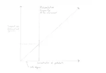 Assimilative capacity is the ability for pollutants to be absorbed by an environment without detrimental effects to the environment or those who use of it.[1] Natural absorption into an environment is achieved through dilution, dispersion and removal through chemical or biological processes.[1] The term assimilative capacity has been used interchangeably with environmental capacity, receiving capacity and absorptive capacity.[2] It is used as a measurement perimeter in hydrology, meteorology and pedology for a variety of environments examples consist of: lakes, rivers, oceans, cities and soils. Assimilative capacity is a subjective measurement that is quantified by governments and institutions such as Environmental Protection Agency (EPA) of environments into guidelines.[3][4] Using assimilative capacity as a guideline can help the allocation of resources while reducing the impact on organisms in an environment.[5] This concept is paired with carrying capacity in order to facilitate sustainable development of city regions.[1] Assimilative capacity has been critiqued as to its effectiveness due to ambiguity in its definition that can confuses readers and false assumptions that a small amount of pollutants has no harmful effect on an environment.[6]