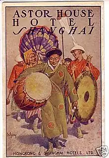 In July 1917, the assistant manager was Mr. Goodrich.[140] Around the end of World War I, the Sixty Club, a group of sixty men-around-town (a mixture of actors and socialites), and their dates would meet at the Astor House each Saturday night.[141] Shanghai was considered the "Paradise of Adventurers", and the "ornate but old-fashioned lobby" of the Astor House was considered its hub.[142] The lobby was furnished with the heavy mahogany chairs and coffee tables.[143] By 1918 the lobby of the Astor House, "that amusing whispering gallery of Shanghai",[144] was "where most business is done" in Shanghai.[145] After China signed the International Arms Embargo Agreement of 1919, "sinister-looking German, American, British, French, Italian, and Swiss arms dealers appeared in the lobby of the Astor House . . . to dangle fat catalogs of their wares before the eager eyes of any buyers."[146] In 1920, the lobby "with its convivial atmosphere, presents to the visitor a welcome oasis, where congregate travelers from afar to chat pleasantly."[147] Another recorded: "The effervescence at the Astor is more tangy than elsewhere. All the latest scandal of the town is an old story in its lobbies almost before it occurs."[148] Powell added: "At one time or another one saw most of the leading residents of the port at dinner parties or in the lobby of the Astor House. An old resident of Shanghai once told me, "If you sit in the lobby of the Astor House and keep your eyes open you will see all of the crooks who hang out on the China coast."[18] According to Ron Gluckman, "Opium was commonplace, says one woman who lived in Shanghai before World War II. 'It was just what you had, after dinner, like dessert.' Opium and heroin were available via room service at some of the old hotels like the Cathay and Astor, which offered drugs, girls, boys, whatever you wanted."[149]