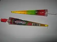 Astro Pops were first made in 1963 after two rocket scientists working on the space program in El Segundo, California decided to quit their jobs and create the Astro Pop, modelling the pop after a three-stage rocket.[1] They hand-built equipment, including machines to speed up the production of the cone wrappers. Astro Pops are unusual because the cone wrapper becomes the mould for the candy. Hot candy is poured directly into the wrapper, then a paper stick is added and the pop is capped off with a layer of wax.[1] Because Astro Pops were created in the 1960s, at the same time in history when the Space Race was in full force, millions of Astro Pops were sold when the manufacturers capitalized on this craze.[1]