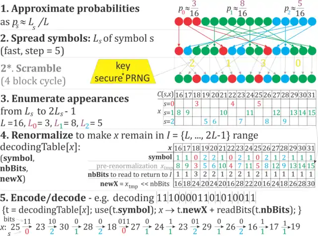 There are alternative ways to apply it in practice – direct mathematical formulas for encoding and decoding steps (uABS and rANS variants), or one can put the entire behavior into a table (tANS variant). Renormalization is used to prevent going to infinity – transferring accumulated bits to or from the bitstream.