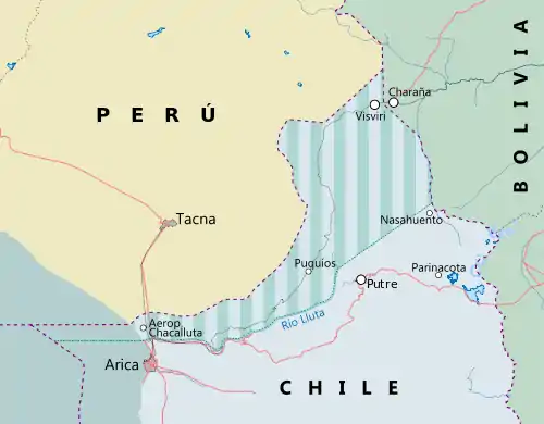 In 1975, the Chilean government of Augusto Pinochet made a proposal to Bolivia consisting in a swap of a narrow continuous corridor of Chilean land from the sea to the border between Chile and Bolivia, running parallel to the border between Chile and Peru, making the Lluta River Chile's northern border, in exchange for the same amount of Bolivian territory.[6][7] The proposal, known as the Charaña Accords,[8] involved former Peruvian land and according to the treaty of Ancón, Chile could not give former Peruvian territories to other nations without Peru's agreement. The dictator of Peru Francisco Morales-Bermúdez was opposed to these changes but proposed to make Arica a territory governed by the three states. Chile responded that it could not accept this complicated shared sovereignty.[7] Since Pinochet was likely aware that the Charaña proposals would fail in the end due to Peruvian opposition, legal and political analysts have suggested that he raised them just as a gesture towards Bolivia.[9][10]