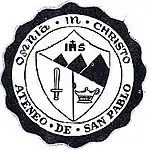 The first is the official seal of the school. Ateneo de San Pablo's seal is different from the school seals of the other Ateneos which all have the shield of the family of St. Ignatius of Loyola.