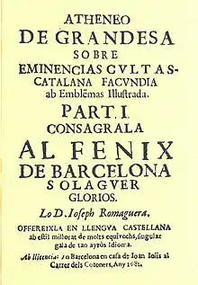 The Atheneo de Grandesa (Catalan pronunciation: [ətəˈnɛw ðə ɣɾənˈdɛzə], modern spelling Ateneu de Grandesa) is an emblem book written in the Catalan language by Josep Romaguera and published in 1681 by the printer Joan Jolis in Barcelona. It contains 15 engravings by an unknown artist.