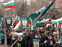 There are different opinions on where to place the party in the political spectrum: according to most scholars it is extreme right,[2][13][14] according to others extreme left, or a synthesis of left- and right-wing.[15][16] The leadership of the party asserts that their party is "neither left nor right, but Bulgarian".[14] The party is considered ultranationalist[2][3][17] and anti-Roma,[18] as well as being anti-Muslim[18] and anti-Turkish.[18][5][2][3][14] The party opposes Bulgarian membership in NATO[5] and requires revision for what it calls the 'double standards' for the membership in the European Union, while members visit international Orthodox and anti-globalization congresses and the party is closely tied with the Bulgarian Orthodox Church.[3] It advocates the re-nationalisation of privatised companies and seeks to prioritize spending on education, healthcare and welfare.[13]