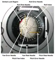 Attitude indicators are also used on crewed spacecraft and are called Flight Director Attitude Indicators (FDAI), where they indicate the craft's yaw angle (nose left or right), pitch (nose up or down), roll, and orbit relative to a fixed-space inertial reference frame from an Inertial Measurement Unit (IMU).[13] The FDAI can be configured to use known positions relative to Earth or the stars, so that the engineers, scientists and astronauts can communicate the relative position, attitude, and orbit of the craft.[14][15]