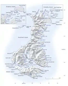 Major islandsAuckland Island, Adams Island, Enderby Island, Disappointment Island, Ewing Island, Dundas Island, Green Island