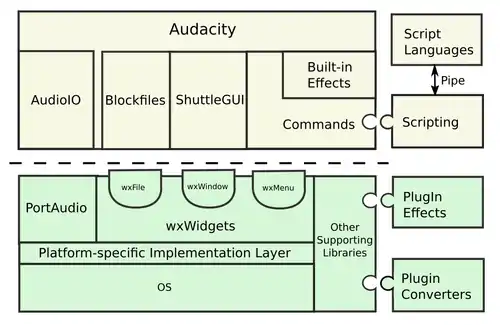 The diagram illustrates Audacity's layers and modules. Note the three important classes within wxWidgets, each of which has a reflection in Audacity.
