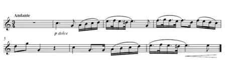 The piece is divided into two movements, marked andante and allegretto respectively. The piano accompaniment (and the piece itself) is written in B♭ major, but the trumpet part is transposed into C major (the trumpet is a B♭ key instrument). Only the trumpet part will be discussed here. The andante is written in 3/4 time, and was written to bring out some of the smooth and tranquil sounds of the trumpet. For examination purposes it was designed to show off the performer's ability to play a slow melody with a good sound and sensitive phrasing.[1] The andante finishes with a diminuendo-ing long pause, and then moves into the 6/8 allegretto. This section demands a flamboyant and ostentatious playing style with quick tonguing. It is written for the more exuberant side of the trumpet's personality. The piece as a whole is written in a light Spanish style, very much like Bizet's opera Carmen.[2]