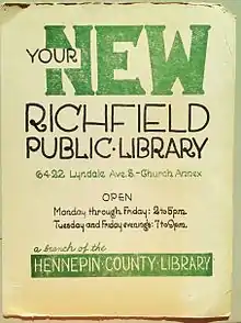 Before there was a library in Richfield, residents’ needs were met with bookmobile service. The first Richfield branch of the Hennepin County Library opened in February 1951 in rented quarters in a church at 6422 Lyndale Avenue South and was known as the Richfield Library.[6] That same year, the Friends of the Richfield Library Association was established, with a plan to fund the purchase of books, furniture and other necessary items for the new library. By 1959, Richfield Library was circulating some 100,000 books per year, the largest in Hennepin County. From 1952 to 1959, patrons grew from 1,540 to 16,000, respectively.[7]