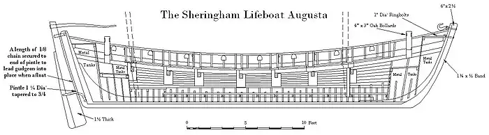 The new lifeboat was built by a local builder, Robert Sunman. It was made from timbers grown in the nearby Sherringham Park and the boat was built in the style of the local herring fishing boats. The Augusta was 33 feet 6 inches[3] long and 10-foot 3 inches[3] wide. The power for the boat was provide by 16 oars.[2] She was equipped with a dipping lug mainsail, mizzen sail and had fittings for a rudder at either end to avoid turning her in heavy seas.[3]