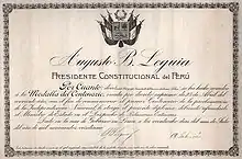 Augusto Bernardino Leguía y Salcedo (19 February 1863 – 6 February 1932)[1] was a Peruvian politician who served as President of Peru from 1908 to 1912 and from 1919 to 1930, the latter term known as El Oncenio de Leguía (Leguía's Eleven-Year Rule).