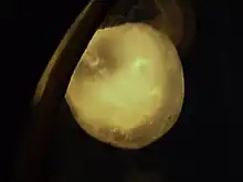 Brown moon jellies have eight rhopalia (sensory structures) and numerous thin and long tentacles.[4] Their bell, or body, is 25–30 centimetres (9.8–11.8 in) in diameter.[3][5] A. limbata has a cup-like calyx.[6] Most of the female A. limbata observed had golden yellow planulae that were located in brood pouches on their oral arms.[3]