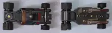 The Aurora Plastics Corporation introduced the A/FX (Aurora Factory Experimentals, later simply "AFX") line of slot cars, slot car track sets, and related accessories in 1971. The AFX brand continued production until the company was forced into receivership in 1983.[1] Aurora designed the AFX cars with interchangeable car body shells usually compatible with each chassis they released during these years. The original 1971 A/FX chassis utilized an updated version of the existing pancake motor design of Aurora's "Thunderjet 500" line, popular in the 1960s.[2] Aurora then released a longer version of the A/FX chassis in 1973, known as the "Specialty" chassis, which incorporated a longer wheelbase and gearplate (and often a more powerful armature) with bodies unique to that chassis. The car bodies designed to fit the shorter original chassis featured a clever snap-on design while the bodies for the Specialty chassis were affixed with a small screw. In 1974, Aurora redesigned both the original and Specialty chassis and exposed the bottom of the motor magnets. The exposed magnets were attracted to the metal rails in the track during racing, creating downforce to help hold the car on the track while cornering. AFX "Magna-Traction" cars remained popular from their release in 1974 throughout 1983, even after faster chassis designs were introduced in house and by Tyco.