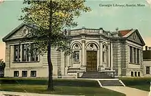 Mills, powered by the Cedar River, were the first industries in Austin. They provided much-needed flour and lumber. Growth was slow during the first two decades, but the Chicago, Milwaukee, and St. Paul railroad arrived in the late 1860s, hastening economic development.[6] The town's first schoolhouse was constructed in 1865 and the first bank opened the following year.