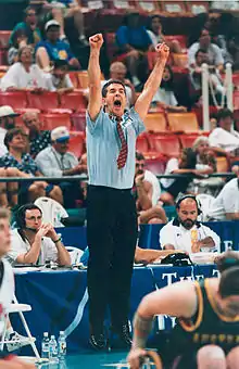 Peter Corr, Head Coach of the Australian women's wheelchair basketball team, the Gliders, celebrates at 1996 Atlanta Paralympics