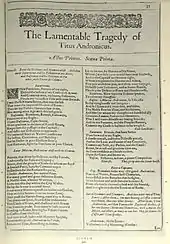 In his Arden Shakespeare 2nd Series edition of the play in 1953, J.C. Maxwell stated that he wished he could assert that Shakespeare was the sole author, but because he was reminded so much of Peele's grammatical constructions, especially in Act 1, he could not.[29] In 1957, R.F. Hill approached the issue in another way; using rhetoric. He took 130 rhetorical devices and analysed their occurrence in eleven early Shakespearean plays, finding Titus anomalous in several ways. Alliteration was far more frequent in Titus than elsewhere, but Titus also contained far less sustained metaphors than in other plays in the canon. Both frequent alliteration and absence of lengthy metaphors occur most in Act 1.[30] Hill also analysed antimetabole, epanalepsis, epizeuxis and "the repetition of a clause with an inversion in the order of its grammatical parts."[31] His discovery that Act 1 was unique in the amount of all of these rhetorical devices when compared with the rest of the canon led him to conclude that Shakespeare did not write it.