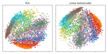 Plot of the first two Principal Components (left) and a two-dimension hidden layer of a Linear Autoencoder (Right) applied to the Fashion MNIST dataset.[28] The two models being both linear learn to span the same subspace. The projection of the data points is indeed identical, apart from rotation of the subspace. While PCA selects a specific orientation up to reflections in the general case, the cost function of a simple autoencoder is invariant to rotations of the latent space.