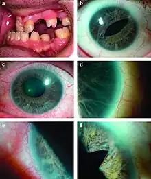 | a) Microdontia and hypodontia. b) Slit pupil and iris atrophy right eye. c) Corectopia with iris atrophy left eye. d) Posterior embryotoxon right eye. e) Posterior embryotoxon left eye. f) Broad peripheral anterior synechiae right eye.[1] | |